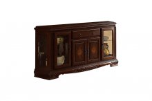 Traditional design elements are elegantly layered to create the beautiful Norwich Collection. Shell motif, egg & dart molding, rope molding, ball and claw feet, with elegantly designed inlay begin the design journey. Book-match cherry veneer prominently highlights the top of the rectangular table and features oval inlay decorative accenting. The table is flanked by chairs that are accented by brown fabric seats. With the china glass fronted doors providing a view of your cherished tabletop accessories, there is also drawer and wood fronted cabinets that allow for additional storage space. The collection is offered in a dark cherry finish.