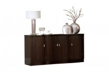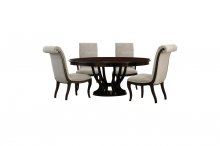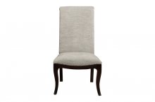 Sophisticated soft contemporary design is achieved in your dining room with the addition of the Savion Collection. Oval single pedestal table featuring a distinct birdcage style base. An espresso finish highlights the unique veneer pattern. Dramatic flair is lent to the design by the accompanying chairs. Neutral tone fabric covers the substantially sized roll back arm and side chairs. Reeded fronts on the server along with the serpentine profile further the elegance of this distinctly sophisticated collection.
