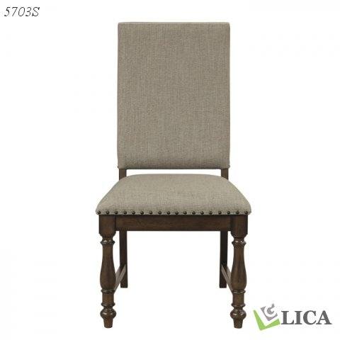 The traditional styling that comprises the design of the Stonington Collection creates an elegant country look for your dining room. Oak veneer is finished in brown creating a perfect highlighting of the distinct pattern of the wood’s grain. The wood-framed side chair features a beige fabric-covered seat and back with accenting nailhead trim.