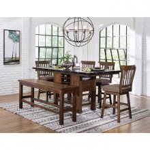 Transitionally styled with a burnished brown finish, the Schleiger Collection features bold accenting and functional storage options. A sturdy storage base supports the metal and rivet banded counter-height table top, with swivel chairs and bench flanking allowing for versatile seating options for this industrial influenced collection.