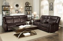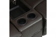 Plush seating with well-appointed features makes the Jude Collection a comfortable and functional addition to your living room. Brown premium faux leather coverings for a bold, yet, neutral statement. Manual motion mechanisms operate with the pull of a side-mounted tab, that once engaged, take you from seated to reclined in an easy motion. Each piece in the collection has an individual function allowing for convenience and comfort. The sofa features dual reclining ends and a drop down center seat back with cup-holders and tabletop space, the dual glider reclining ends of the love seat flank a center mounted console with storage and cup-holders.