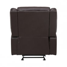 Plush seating with well-appointed features makes the Jude Collection a comfortable and functional addition to your living room. Brown premium faux leather coverings for a bold, yet, neutral statement. Manual motion mechanisms operate with the pull of a side-mounted tab, that once engaged, take you from seated to reclined in an easy motion. The chair features a glider mechanism that allows for easy back and forth motion.