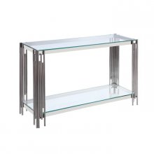 With a profile that invokes a feeling of a city skyline, the Porfirio Collection will add dramatic character to your modern living room. Vertical rods comprise the exterior corner supports of the glass-topped sofa table. Lower glass shelves create additional space to display your finest home accessories.