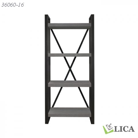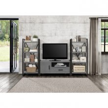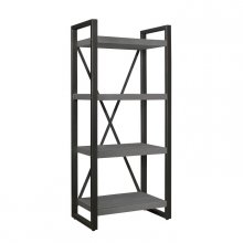 Gunmetal finish provides distinct contrast to printed gray wood grain melamine veneer in the Dogue collection. The 4-shelf bookcase features open display shelving. 63-inch TV stand, 76-inch TV stand, side piers, slide-in cabinet and baskets are also available.