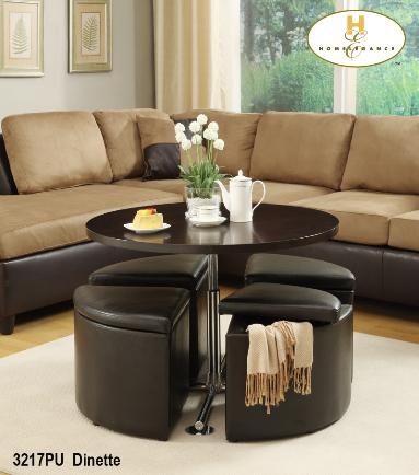 The Rowley Collection. Round Gas-lift Coffee Table you can convert to a Dinette Table with 4 Dark Brown Leatherette triangle Ottomans. |