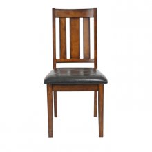 The burnished finish and classic profile of the Delmar Collection will be a perfect fit for your modest casual dining space. Splat back wood chairs with black faux leather seats flank the dining height table offering. Routed detailing provides a linear focal point on the table top.