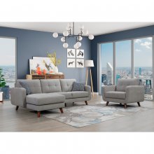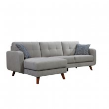 Add contemporary freshness to your living space with the graceful shapes and contrasting colours of the Noma Sectional. Available in blue and grey, this piece boasts linen-like fabric with tufted stitched cushions, maple hardwood flared feet and accent print toss pillows and ottoman. High style and top quality all in one!