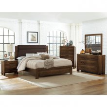 Whether your home leans to transitional or contemporary design, the Sedley Collection will be the perfect fit for your bedroom. From the distinct walnut veneer pattern – with walnut finish - to the unique cut-away design, each design component lends to placement in a variety of bedroom spaces. The dark brown tone of the inset headboard fabric compliments the finish of the group.