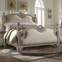 An updated look to the grandeur of Old World Europe is flawlessly executed in the Orleans II Collection. Acanthus leaf carvings feature prominently and blend with elegantly appointed moldings on the Queen bed. Wreath accents lend dramatic flair to the bed as does the sculpted lion’s foot base. Heavy pilasters rise and topped with carved finials on the neutral-toned, linen-accented headboard and footboard. The washed white and weathered brown two-tone finish lends to the unique styling of this elegant bedroom collection.