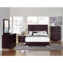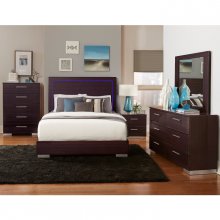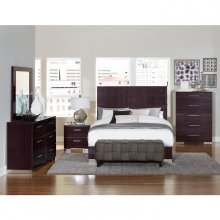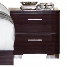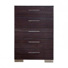 Taking contemporary design to a new level is the Moritz Collection. Dramatically eye-catching from the distinct veneer pattern of the faux veneer to the high-gloss sheen and chrome accents, this bedroom collection is sure to give your bedroom the modern look that you so desire. The dark smoky tone of the faux veneer is lent magnificent accenting by the silver-tone of the patterned grain. The nickel finish of the elongated vertical hardware provides complementing visual contrast.