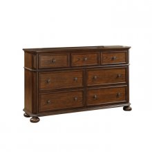 Book-match mindy veneer immediately draws your eye to the transitionally styled Langsat Collection. The versatile brown finish combined with knob hardware, bun feet and classic framing make this dresser a welcome addition in a number of home styles. Functional hidden drawers are featured in the dresser, providing discrete storage space.