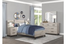 The sleek design of the Zephyr Collection pairs clean lines with modern convenience to create a style that will be the perfect palette for your design aspirations. The collection’s nightstands flank the low-profile bed, creating a wall-paralleling seamless transition between the pieces. Visually tying the collection together are the painted metal-finish banding of the headboard’s sides and the case piece’s base rails, as well as the metal bar hardware that fronts each drawer, culminating in an accenting contrast to the gray faux wood finish of the melamine veneer.