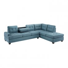 The convenience of being able to configure your chosen sofa to your available space is a reality with the Dunstan Collection. The reversible 3-seat unit is paired with a chaise unit, each featuring the flexibility of design to reverse the arm configuration, allowing for right or left side placement of the chaise. The 3-seat unit features a centrally located drop-down sofa back which when opened reveals two cup holders. The Dunstan Collection is covered in blue upholstered fabric, a perfect accent to your home’s transitional aesthetic.
