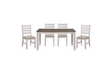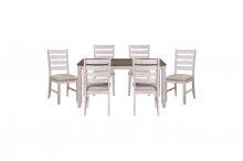 With a neutral palette and transitional design, the Ithaca Collection will place perfectly in your casual dining room. The two-tone finish that graces the acacia veneer - the legs and apron a grayish-white supporting the medium brown top - creates a canvas for your decorative tabletop accessories. The fixed top table is flanked by wood framed chairs with wheat colored linen fabric seats.