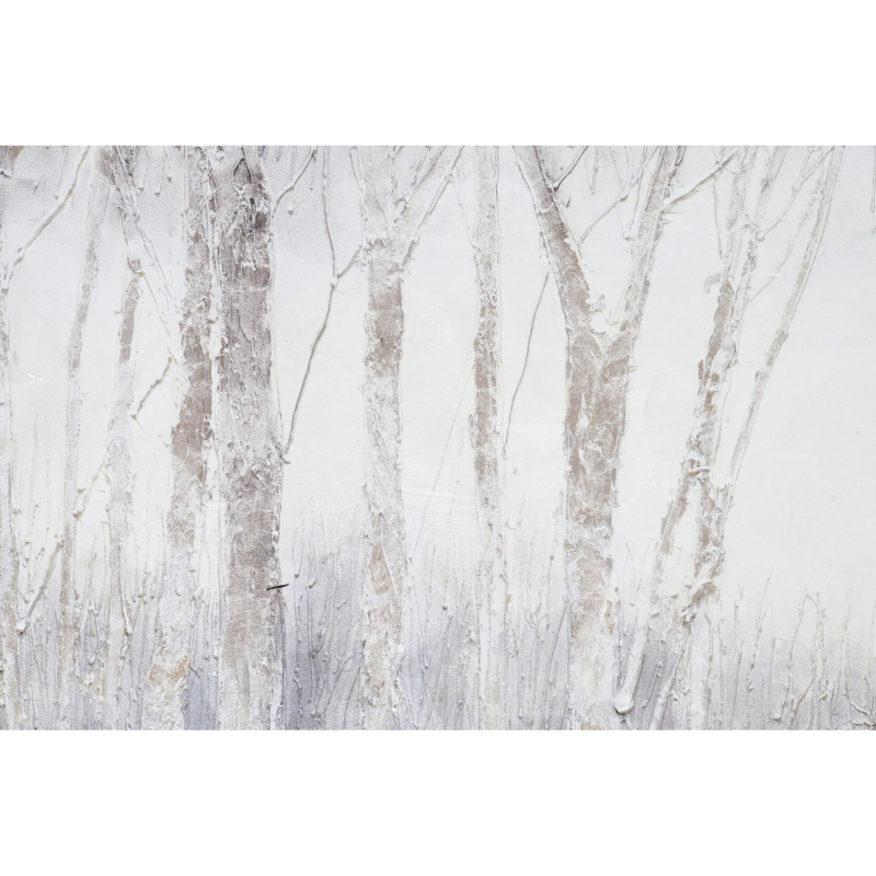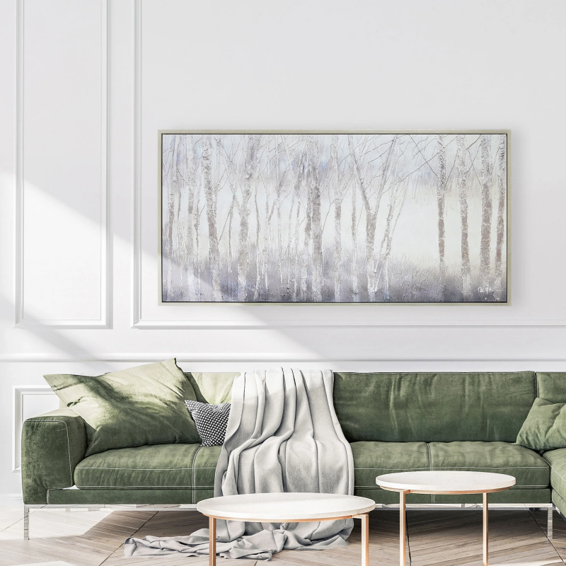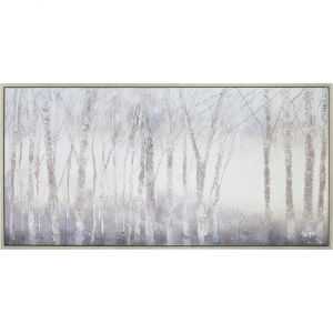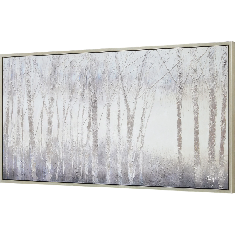 The dark energy of the woods on a crisp, cool day is captured within a canvas and poured into the home through this work of printed art. A silver frame serves as a cohesive addition to the grey palette. Grand in size, this design is at its best when set above a focal piece of furniture in any space. Product Details: