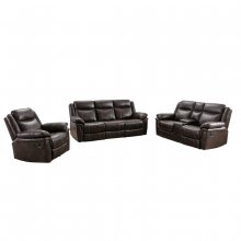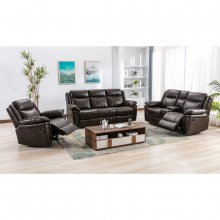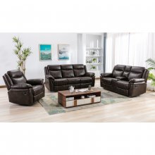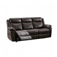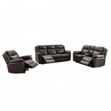 Bring function and flair to your transitional living room with the suave charm of the Peabody reclining sofa collection. Wrapped in rich brown leather gel, the sofa's supple upholstery feels delightfully pliant and smooth against the skin. Plump pillow armrests combined with a generously stuffed headrest guarantee utmost relaxation, especially in tandem with dense foam over coils for the ultimate in seating comfort that won't lose its shape over time. Stretch out and recline with double tab-pull latches to complete your relaxation experience. Black piping with contrast stitching provides additional visual interest for this handsome set. Also available in grey leather gel.