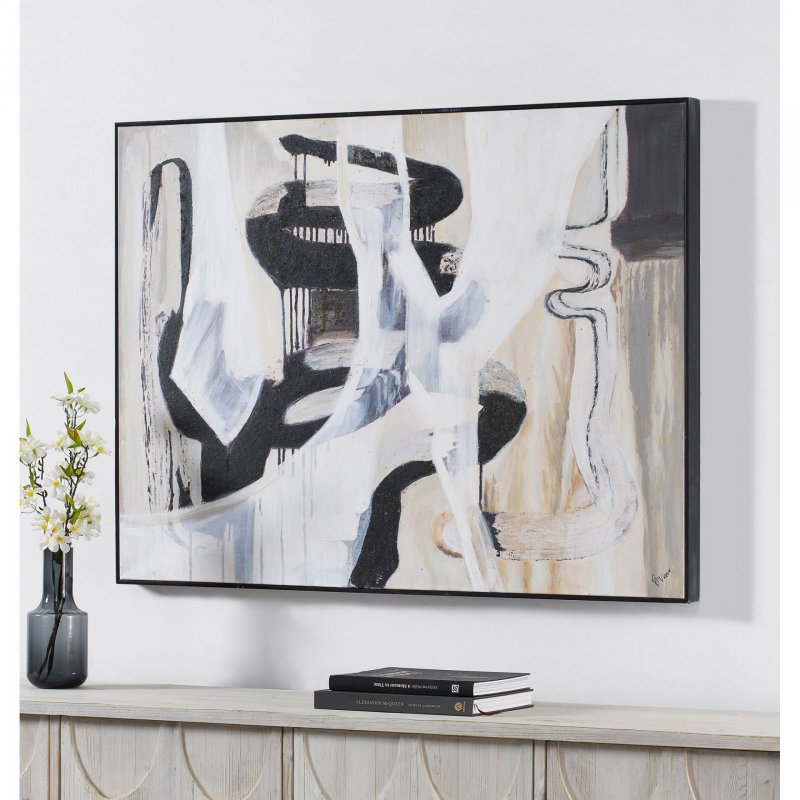Style: OL2102 | Dimensions : 48\"W X 36\"H X 2.17\"D The minimal interior benefits from a pop of personality when this cotton canvas is set on the wall. The blend of textured painting, completed by hand, and print input, coupled with the squiggles and stripes, gives this design a street art feel. A thin black frame keeps the intricacy of the piece contained. Artist: Edward View InStock:23 Retail CAD:$785