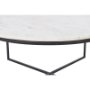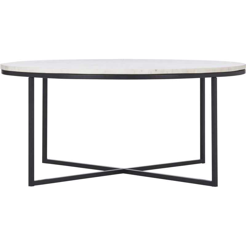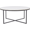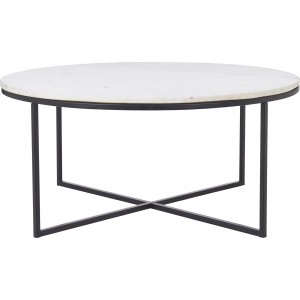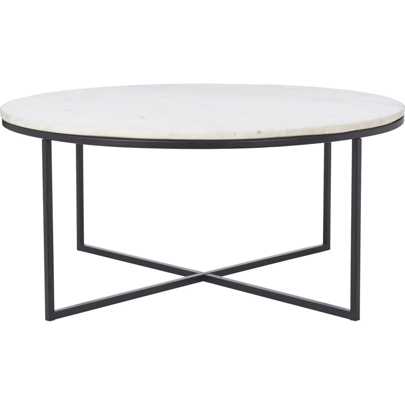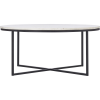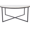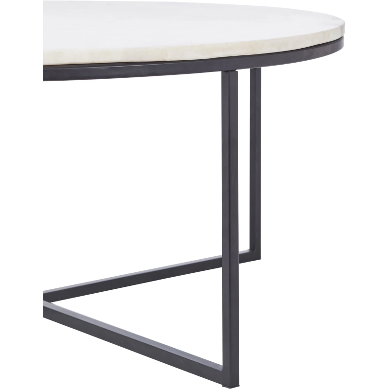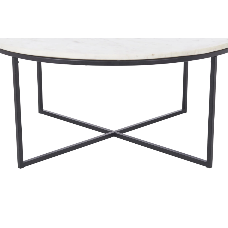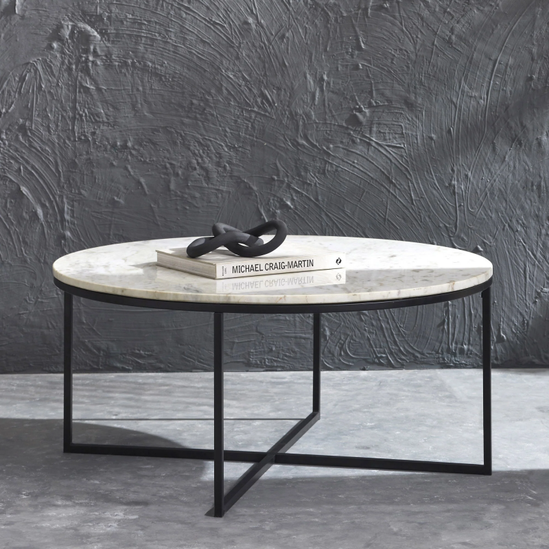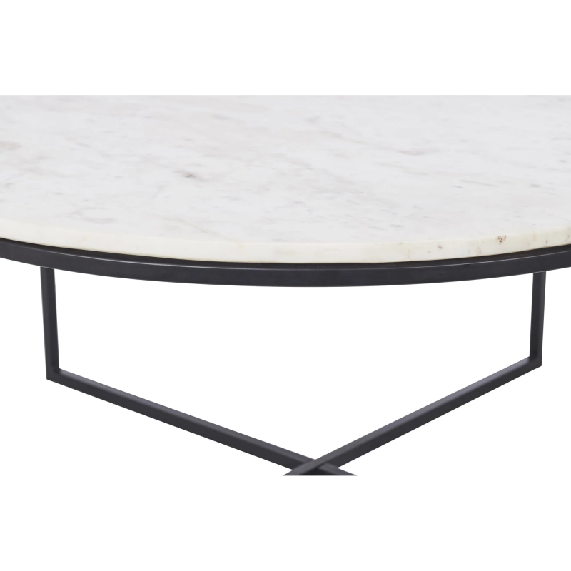 This coffee table's exquisite elegance radiates across the contemporary living room. Thanks to a matte black powder coated legs, it is inherently strong and sleek, all while the natural white marble offers a light glow. With a 35 inch circumference and 15 inch height, its size provides plenty of versatility for arrangement. Product Details: