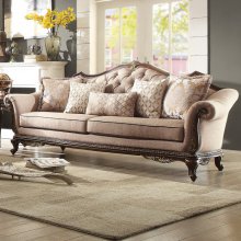 With styling that exemplifies traditional design, the Bonaventure Park Collection exudes sophistication and refined elegance. Cabriole legs support the rolled arm show wood frame, while egg and dart molding, along with acanthus leaf motif lend to the base and top rail of each piece in the collection. Providing contrast to the gold-highlighted cherry finish of the frame is the brown tone chenille fabric. Complimenting contrast pillows feature three traditional patterns with each featuring accenting appropriate to their style such as faux leather piping or looped fringe. Pleated tufting is anchored by button accent providing classic prominent detail to this elegant seating collection.