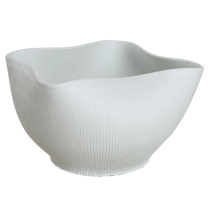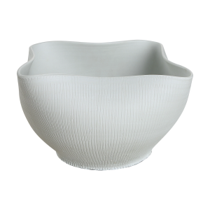 This bowl-shaped ceramic vase can be strictly decorative or serve as a utilitarian vessel, with everyday essentials or keys resting inside. Clients in modern and contemporary homes will find the porcelain ceramic vase's waving design and ribbed texture lend a casual yet chic vibe to their space. Resting atop an entryway table, on a bedroom dresser or living room table, it quickly becomes an essential component of the homeowner's everyday routine. Product Details: