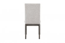 At the intersection of modern and rustic design, the Gresham Collection brings you to a full stop. Clean lines are paired with the natural beauty of acacia veneer, while a gray finish lends neutral versatility to the décor of your casual dining room. The rustic look of the plank tabletop is interrupted by the modern lines of the table apron’s angled edge. Coordinating side chairs feature wood legs and gray fabric upholstered seats, with profile-defining nailhead trim. The open display shelving of the server further lends to the modern look of the collection while providing drawer storage for your tabletop décor.