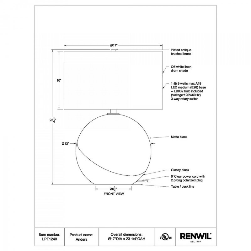 Style: LPT1240 | Dimensions : Dia-17\" X 23.25\"H At once matte and glossy, this table table lamp calls for a second glance from any passerby. With an effortlessly chic style, the contrast of textures and tones has the chance to take center stage. Set in the contemporary living room, entryway or bedroom interior, this table lamp enhances the style factor of the entire space.