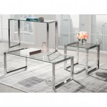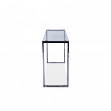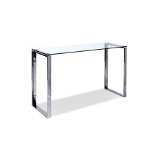 Sleek and modern, the Metro sofa table adds a strong dose of style to any room. This minimalist profile boldly commands your eye thanks to the contemporary U-shaped framing of the base in a brightly shining chrome finish. Constructed from sturdy stainless-steel, the base easily holds the thick, clear tempered glass top aloft. This light and airy combination boasts a surprisingly large tabletop with lots of space for mugs, lamps, or décor, providing ample function without appearing overly large or heavy. Glass and open metal lets light shine through and reflect, giving the table a bright and clean aesthetic that will instantly refresh your home. Other coordinating occasional tables are also available.