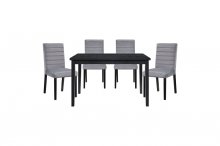 The design of the Andreas Collection is scaled to seat four, making this modern dinette group the perfect addition to your casual dining space. A black finish is utilized over ash veneer highlighting its distinct veneer. Grey upholstered chairs are paired with the table, each featuring horizontal contouring and modern lines.