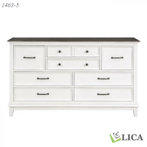 Exuding the aesthetic of casual country living, the Chesterton Collection’s classic lines create a look that perfectly captures your preference for farmhouse design. The two-tone finish of the collection is a warm contrast of dark brown and antique white. The knob and bar hardware that fronts the drawers of the dresser provide distinct complementing contrast to the collection’s finish.