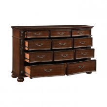 Rich in the aesthetic of Old-World tradition, the design of the Adelina Collection is the culmination of classic accenting that creates an elegant presentation for your bedroom. The serpentine front of the dresser features framed drawers, fixed-pull traditional hardware, acanthus leaf carvings, as well as bun feet. Furthering the timeless aesthetic that permeates the collection, is the cherry finish over birch veneer and pine solids.