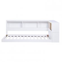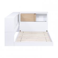Providing the perfect landing pad for your child’s bedroom, the Asker Collection is a fun and functional addition to their space. The two-tone white and natural finish of the pine veneer is paired with the mid-century modern design to create a classic profile. The twin-size bed’s floor level ultra-low profile platform features a sliding door bookcase headboard while the side-mounted bed-length open bookcase provides plenty of display storage.