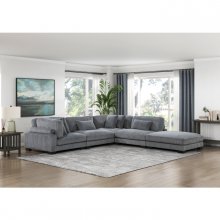 Configurable to your available space, the Traverse Collection allows for the addition and detachment of pieces for a customized seating experience. The 5-piece sectional configuration consists of two corner units paired with two armless chairs, and an ottoman. The plush gray corduroy fabric upholstery creates a plush expanse for a soft touch experience.