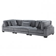 Configurable to your available space, the Traverse Collection allows for the addition and detachment of pieces for a customized seating experience. The sofa configuration consists of two corner units paired with a centrally placed armless chair. The plush gray corduroy fabric upholstery creates a plush expanse for a soft touch experience.