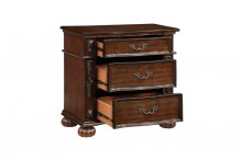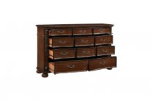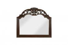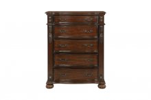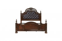 Rich in the aesthetic of Old-World tradition, the design of the Adelina Collection is the culmination of classic accenting that creates an elegant presentation for your bedroom. The intricate scroll detail of the bed’s top rail, and mirror’s frame, provide eye-catching detail, while the bed’s additional accents display prominently by way of the faux leather padded headboard with button-tufting, framed profile, detailed finials - that top the pilasters of the bed – in addition to the acanthus leaf carvings and bun feet that support each piece of the collection. The serpentine fronts of the dresser, nightstand, and chest feature framed drawers and their fixed-pull traditional hardware. Furthering the timeless aesthetic that permeates the collection, is the cherry finish over birch veneer and pine solids.