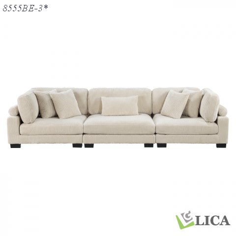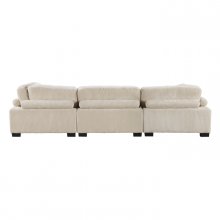 Configurable to your available space, the Traverse Collection allows for the addition and detachment of pieces for a customized seating experience. The sofa configuration consists of two corner units paired with a centrally placed armless chair. The plush beige corduroy fabric upholstery creates a plush expanse for a soft touch experience.