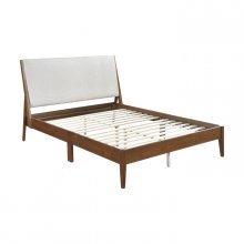 Subtle Mid-Century Modern inspiration drives the design and lends a classic profile to the modern lines of the Jasper Collection. The full-size low-profile wood-framed bed features a chestnut finish, its warm hue a perfect complement to the light gray chenille fabric upholstered headboard.