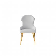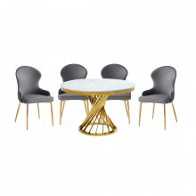 Modern glam meets renaissance royalty with the gold and marble accenting of the Venus Dining Set. This beautifully appointed collection is a work of art thanks to its sculptural profile and gorgeous finishes. Instead of a solid pedestal, the table’s base is comprised of numerous gold-finished metal bars that gleam as they gently spiral up to support the tabletop. The round dining surface showcases a realistic white faux marble finish, achieved by layering marble paper over genuine stone for a convincing tactile experience that combines the cool heft feel of true marble with a non-porous laminated surface that is easier to clean. Coordinating side chairs having matching gold legs and are upholstered in your choice of white or grey faux leather. The back and seat cushions are foam-padded for comfort with a beautiful contoured profile accented by diamond-quilted stitching. Imbued with depth and dynamism, the Venus is an enchanting addition to your contemporary dining room.