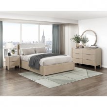 Soft modern lines comprise the design of the Matteo Collection, while convenience features provide functional accent to your bedroom. The light oak finish over oak veneer is complemented by the oyster-hued textured fabric upholstery that covers the padded headboard lending a light and airy aesthetic to your bedroom. Charging ports are conveniently mounted on the built-in side shelves of the queen headboard. Storage space comes in the form of the bed’s footboard drawer.