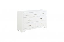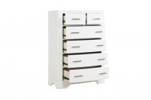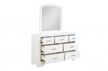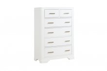 The intersection of modern lines and understated transitional style blend to create the Hudson Collection. Available in a white finish, the collection presents a decoratively versatile addition to your bedroom. Polished chrome bar hardware fronts the dresser, chest, nightstand, and storages drawers of the bed’s footboard. The curved design of the bed’s headboard carries over to the top rail of the mirror.