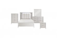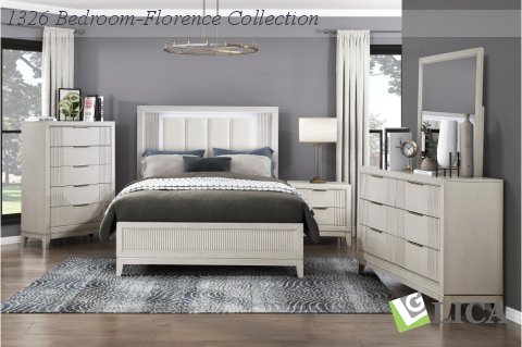 Subtle modern accenting inspires the classic design of the Florence Collection, each element pairing to create a visually appealing look for your bedroom. Reeded accenting fronts the ivory-hued padded LED back-lit headboard, footboard, and drawer fronts of the dresser, nightstand, and chest. Polished chrome edge-pull hardware centers each drawer front. The antique white finish of the collection lends a refreshing hue to your room’s décor.