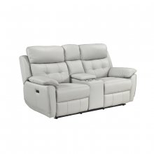 The Oliver Collection is where modern design meets the perfect blend of stylish, unparalleled comfort. Crafted to cater to all your relaxation needs, this exceptional loveseat showcases beautiful artistry with stunning silver leather on all fronts that touch your skin, while top quality faux leather-match covers the back and sides for incomparable coverage. Supportive seating with deliciously overstuffed headrests and padded pillow-style arms creates a comfortable lounging space for your family and friends, all tied together with tailored stitching and biscuit-tufted accents. But the luxury does not end there - experience the convenience of power reclining at your fingertips and adjust your position to whatever feels best to you. Moreover, the central console proffers interior storage for your devices and cupholders for your beverages so that your relaxation can be complete. With its sumptuous appearance and impressive workmanship, the Oliver offers premium seating at its best.