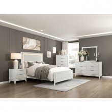 Bold geometrical styling is paired with unfettered modern lines to create the unique design of the Asteria Collection. An antique white finish highlights the collection’s oak veneer. Flat black finished metal bar hardware fronts the drawers of the chest. Asymmetrical routing fronts the drawer faces for dramatic accent to the collection.