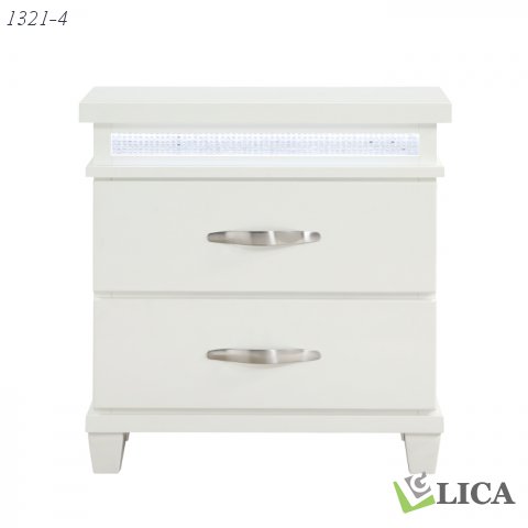 Elegance is beautifully captured in the design of the Kidman Collection. Inset faux crystal banding and LED backlights provide accent to the nightstand creating a reflective glow against the white finish. Polished chrome bar hardware fronts each drawer face of the nightstand.