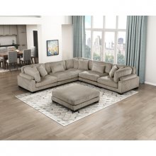 Configurable to your available space, the Traverse Collection allows for the addition and detachment of pieces for a customized seating experience. The 6-piece sectional configuration consists of three corner units paired with two armless chairs, and an ottoman. The taupe corduroy fabric upholstery creates a plush expanse for a soft touch experience.