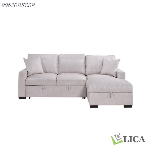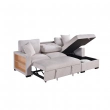 Experience a new paradigm of functionality with the stylish Pallas Collection. This 2-piece sofa sectional was designed to elevate your living space with features that are both posh and practical. Upholstered in beige fabric for a timeless look, its clean modern design has crisp edges that add a touch of sophistication to your living room. The right side chaise offers hidden storage, perfect for keeping your space clutter-free, while the loveseat boasts a hidden bed that effortlessly pulls out and pops up so that you can accommodate overnight guests in style. The square track arms not only enhance the contemporary appeal but also feature open shelves for books or devices, seamlessly blending form and function. The loveseat's central back cushion also drops down to reveal a table with two cupholders, making movie nights or entertaining easier than ever. Beautifully crafted for all your needs, the Pallas is the ideal indulgence for your living room thanks to a perfect harmony of style and practicality.