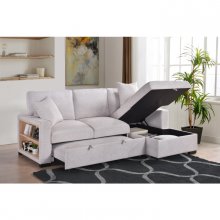 - Includes 2 pieces: left side loveseat featuring pull-out sleeper with drop-down table + right side storage chaise
