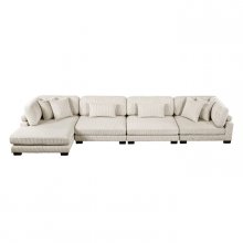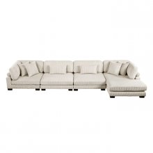 Configurable to your available space, the Traverse Collection allows for the addition and detachment of pieces for a customized seating experience. The 4-piece sectional configuration consists of one corner unit paired with two armless chairs, and a chaise. The beige corduroy fabric upholstery creates a plush expanse for a soft touch experience.