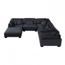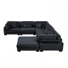 Configurable to your available space, the Traverse Collection allows for the addition and detachment of pieces for a customized seating experience. The 6-piece sectional configuration consists of three corner units paired with two armless chairs, and an ottoman. The black corduroy fabric upholstery creates a plush expanse for a soft touch experience.