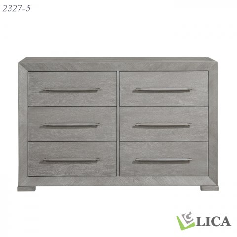 This sophisticated dresser offers generous storage and a sleek modern aesthetic, making it an ideal addition to any contemporary bedroom. Constructed from a durable blend of embossed oak veneer, wood, and engineered wood, and finished in an elegant gray, it promises both longevity and style. Featuring six spacious dovetail drawers, each equipped with smooth ball-bearing glides, this dresser provides ample and organized space for all your clothing and accessories. The subtle gray-tone wooden handles beautifully complement the dresser's clean lines, enhancing its understated elegance and functionality.