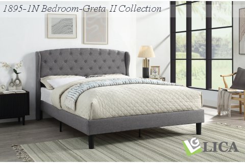 With its versatile transitional styling, the Greta II Collection's timeless appearance provides a classic accent to a wide range of bedroom décors. This gorgeous Queen Bed is upholstered in an airy light grey linen-like fabric that accentuates the graceful wings of the shelter headboard. Fully padded so you can comfortably prop yourself up, the headboard's most attractive feature is the diamond-quilted button tufting, which lends a winsome, tailored look to the design. Although this bed is furnished with a platform design that elevates the mattress, a 10-inch or higher mattress is recommended. With its fashionable design and elegant craftsmanship, the Greta II is an impeccable addition to any bedroom.